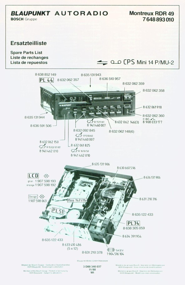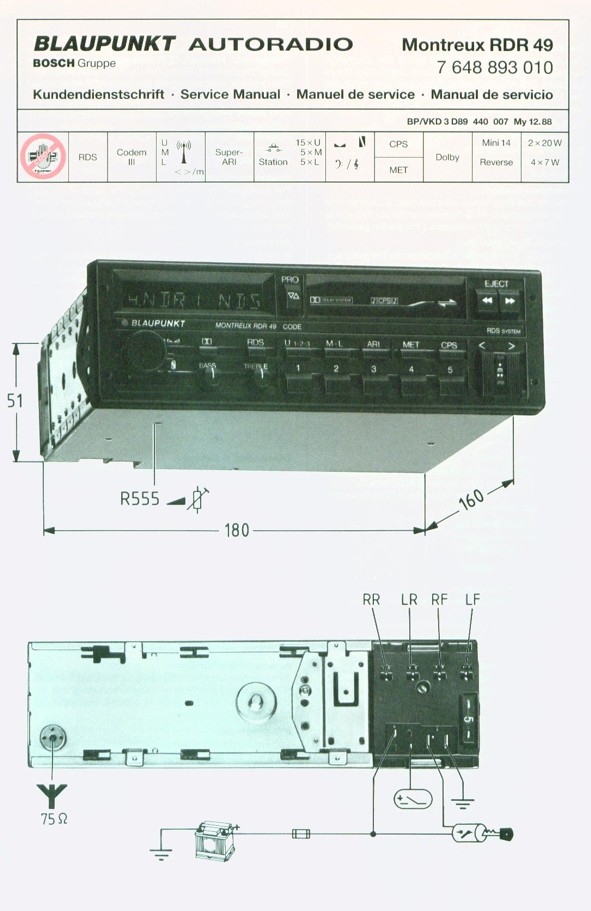 Autoradio BLAUPUNKT Montreux RDR 49 (7 648 893 010) Le premier autoradio de la marque équipé du décodeur RDS - Tuner 3 gammes d'ondes avec décodeur ARI (Traffic réseau allemand) K7 autoreverse avec de nombreuses fonctionnalités - Protection par code - 2 x 20W ou 4 x 7W suivant connecteur ISO |