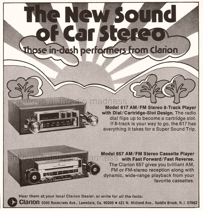 Publicité de presse américaine de la gamme CLARION avec lecteurs 8 track (8 pistes): |